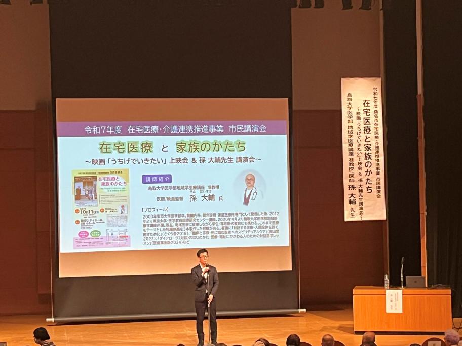 医師であり、また鳥取大学医学部地域学医療講座の准教授として地域医療の教育に携わる孫大輔先生から「在宅医療と家族のかたち」と題した講演を行っていただきました。この講演会を機に、在宅医療について理解を深め、自身や家族の将来について考えるきっかけとなれば幸いです。