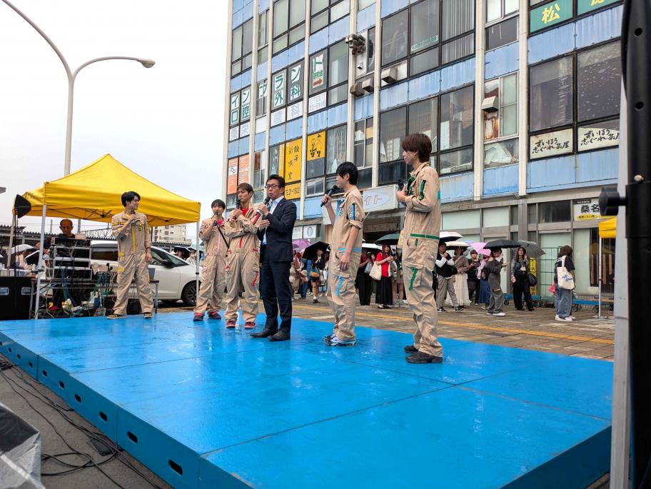 ボイメンのメンバーが焼いてくれた団子をいただき、ステージでも共演させていただきました。少し雨も降っていましたが、市外からも多くの方にお越しいただいており、ボイメン人気の高さを実感しました。