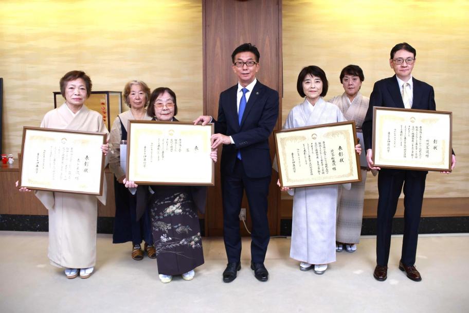 今年度は茶道に関連する「茶道裏千家」「煎茶松風流」「表千家流」「遠州流茶道」の4団体を表彰させていただきました。この4団体は協力され、平成7年から六華苑で月釜茶会を開催していただいています。市民に気軽に参加できる茶会の場を提供していただくなど、これまで市の文化振興に大きく寄与していただきました。ご受章おめでとうございます。
