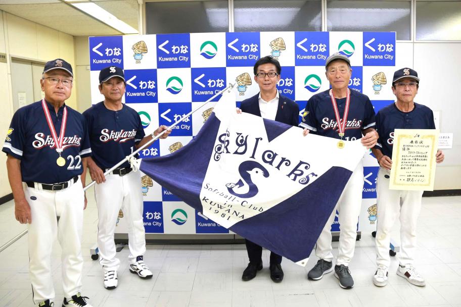 新潟県で開催された「第20回全日本ハイシニアソフトボール大会」で初優勝を飾ったスカイラークスの皆さんが訪問してくれました。